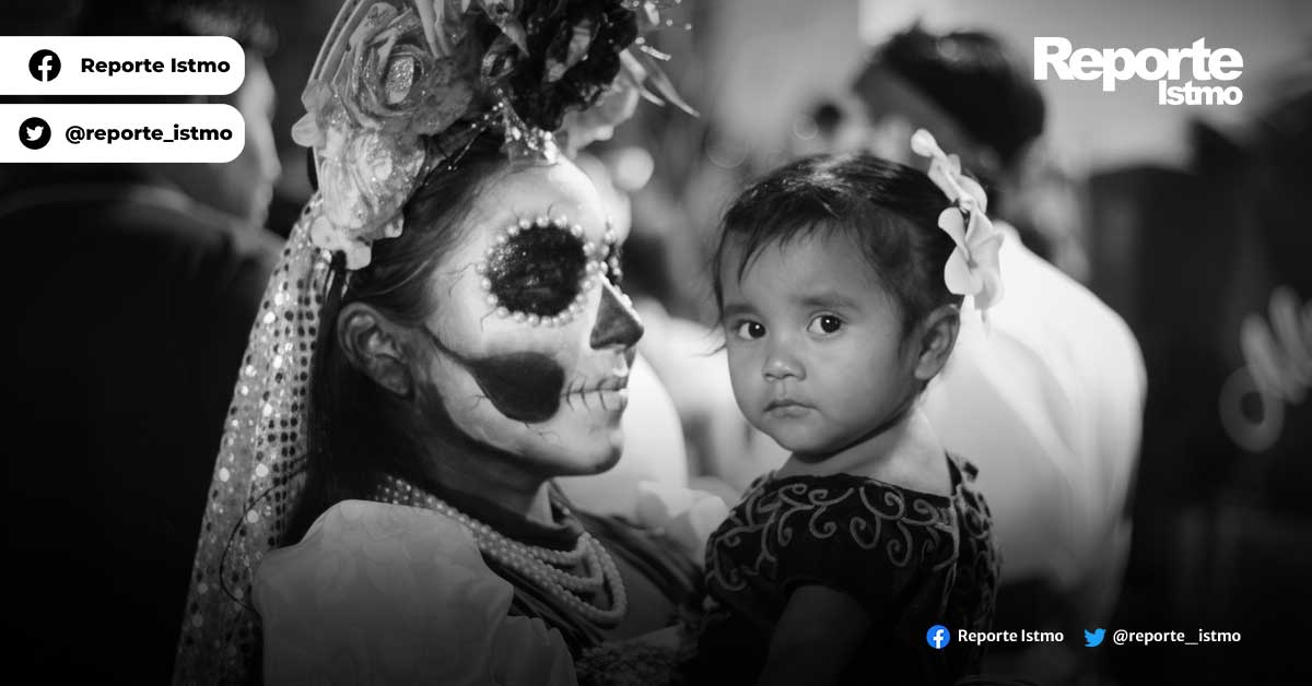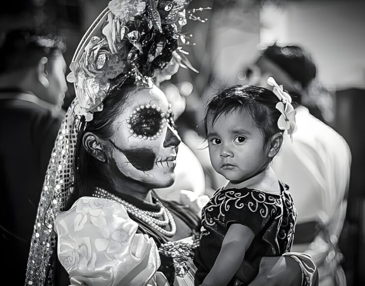 En la imagen, una mujer con el rostro pintado como calavera sostiene a una niña en brazos. La escena es poderosa: la muerte y la vida se funden en un mismo abrazo. Ella representa a la catrina, elegante y serena; la niña, la nueva generación que hereda el arte de recordar sin miedo.