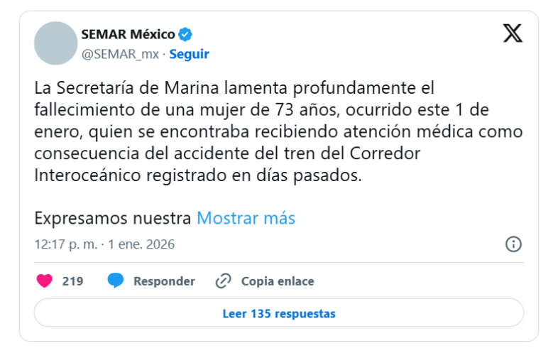 El número de víctimas mortales por el descarrilamiento del Tren Interoceánico del Istmo de Tehuantepec, ocurrido el domingo en Oaxaca, aumentó a 14 personas, tras confirmarse el fallecimiento de Hilda Alcántara Alvarado, una mujer de 73 años que permanecía hospitalizada debido a la gravedad de sus lesiones.